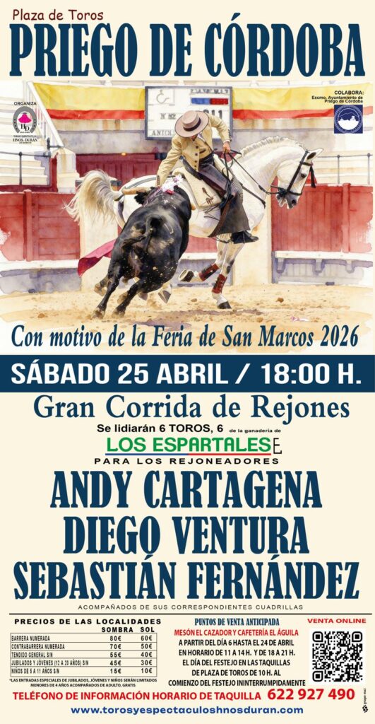 Con motivo de la Feria de San Marcos 2026, se celebrará una gran Corrida de Rejones, con toros de la ganadería Los Espartales, y serán lidiados por las figuras del rejoneo Andy Cartagena, Diego Ventura y Sebastián Fernández.
